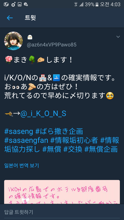 몇일전에 짹에서 사생관련문제로 난리났었는데 알고있어? #saseng 서치해보니까 번호교환글이랑 개인정보판다고 글 잔뜩있던데 거기에 아이콘도있더라 아이콘은물론 가족들도있었어
