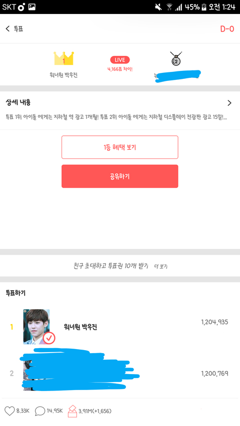 안뇽 소식 알리러 왔어! 우진이 ㅍㅌㅋㄷ 3위였다가 새벽 1시 20분자 총공으로 1위 진입해서 유지중이야! 투표는 10일 오후 5시까진데 여기 어플이 워낙 유리서버라 투표한 표가 다시 돌아오는 경우도 있고 그래서 모아놓은 표가 있다면 ☆최소 1시간 전☆에는 다 부어줘야해!!! 그리고 마감 전까지 모으고 바로 퉆 해주면 돼❤ 혹시나 처음 안 참팬이 있다면 지금이라도 앱깔구 투표해주자! 타그룹 분은 가릴게!