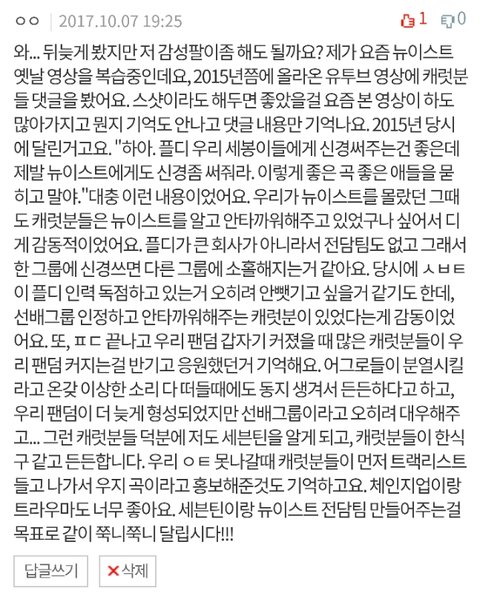 들고온 짤은 우리 팬톡에 왔던 캐럿님의 글에 달았던 댓글인데 제가 늦게 답을 달아서... 못보셨을거 같아서 수줍게 들고왔어요.