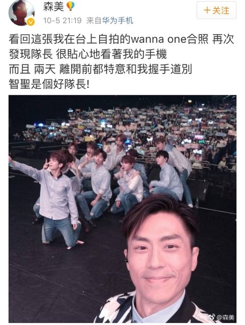 중국어(?) 해석 : [내 사진첩에 워너원과 같이 찍은 사진을 다시 보니까 리더 지성군이 내 카메라를 다정하게 쳐다보는걸 발견했다.그리고 공연하던 이틀동안 퇴근하기 전에 꼭 나한테 인사하고 가는 지성군은 정말 좋은 리더다]