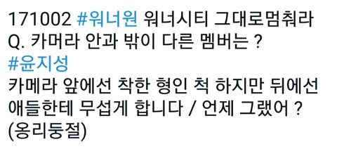 또 음방에서 말정리 너무 잘해주고 얘들한테 먼저 수고했다고 말해주고 아침에도 멤버들 깨워주는 윤지성의 리더미 너무 칭찬함ㅠㅠㅠㅠㅠ