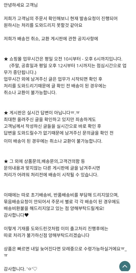 10월3일에 제가 인터넷쇼핑몰에서 옷을 샀다가 저녁때 배송전 취소/교환 게시판에 취소해달라고 글을 남겼습니다 쇼핑몰은 9월30일부터 10월9일까지 연휴기간이라 업무를 하지 않는다고 했습니다 저는 10일쯤 취소해 주겠거니 해서 기다렸습니다 그런데 10월8일 일요일에 배송되었다고 카톡이 왔습니다 저는 취소해달라고 게시물을 남겼기때문에 뭔가 잘못됐다고 생각하여 고객센터에 연락을했지만 연휴기간이라 연락을 받지않았습니다 어떠한 방법이 없어 10일까지 기다렸다가 답변을 보았는데 저런 답변이 와있는겁니다 연휴기간이라 다른업무는 안하는데 배송업무만 하고 배송업무를 하려면 최소한 '배송전' 게시판을 먼저 보고 확인해야 되는거 아닌가요? 반품해도 배송비는 제가 부담하라고 합니다 정말 어이가 없는데 이게 제 잘못인가요? 신고할 수 있을까요? 정말 화가 나서 조언좀 부탁드립니다 긴 글 읽어주셔서 감사합니다