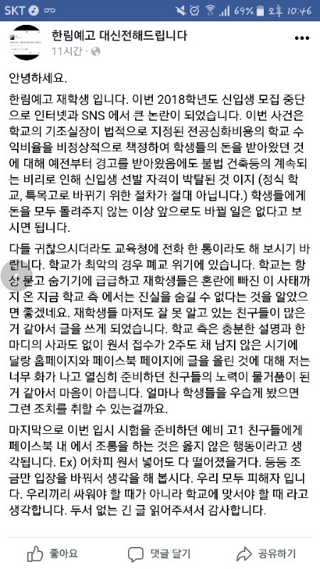 저거 사실임 나는 공지 뜨기 전부터 친구랑 입소문으로 알고 있었음 학교가 잘 못해서 신입생 못 뽑는 거임 사실 지금 1학년들이 입학 할 수 없었음 근데 걍 뽑은 거 그리고 이번 년도 공지를 서공예 입시 3주도 안 남은 지금 알려준 거ㅇㅇ 실기만 믿고 올인한 게 잘못이다 하는데 걔네는 정말 그것만 바라보고 온 거임 솔직히 여기선 내신 관리 안 한 애들보다 한림이 잘 못 100임 사실 원래 쟤네 실수로 이지경 온 거라ㅋ