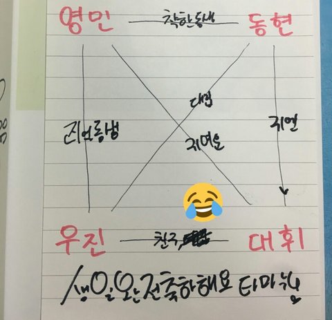 왠지 모르게 진짜 저럴거 같고 둘이 너무 귀여워 막냉이들 표를 보면은 친구 옆에 대립이라고 쓰고 지운거 같은데 둘이 장난 진짜 많이 칠듯ㅋㅋㅋㅋ