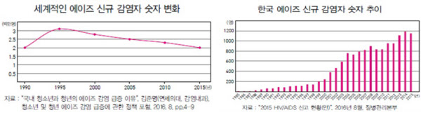 한국은 지난해 2016년 에이즈 신규 감염자 수가 1062명으로 조사됐다. 2000년(219명)과 비교해 26%나 증가했다.