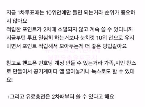 이번 투표가 중요한게 아니구 27일부터 시작하는 최종투표가 중요한거래.이번에는 10위권에만 들게 조절하고 포인트 모아뒀다가 최종투표에 올인해야 된대!! 포인트