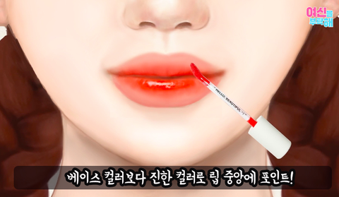 베이스 컬러보다 진한 컬러 (포인트 컬러로 주고싶은 컬러)를 립 중앙에 발라주자