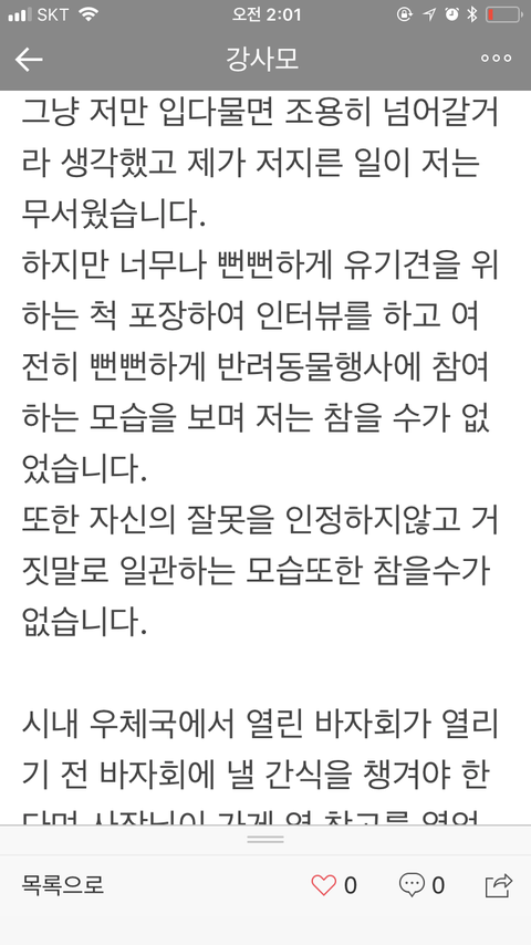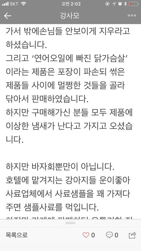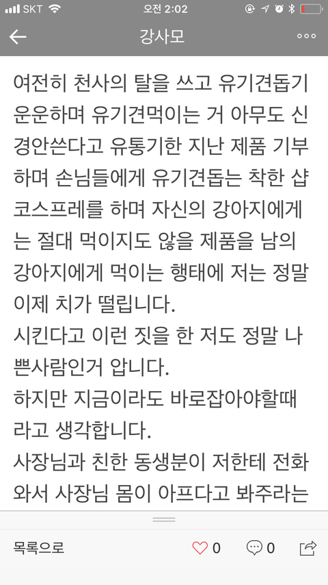양심고백을 한 직원을 도리어 개를 때려서 일을 그만뒀다는 말도