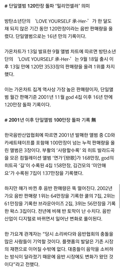 와 개쩔어 이번에나온 단일앨범 loveyourself her가 벌써 120만장 돌파했대ㄷㄷ 단일앨범으로는 god이후로 16년만ㄷㄷㄷ