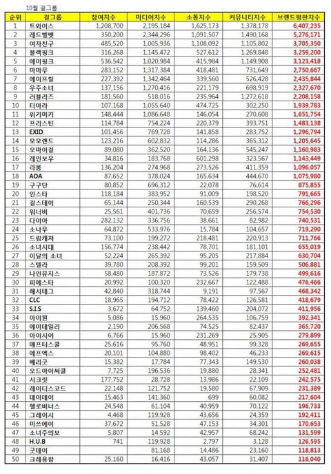 2017년 10월 걸그룹 브랜드평판 30위 순위는 트와이스, 레드벨벳, 여자친구, 블랙핑크, 에이핑크, 마마무, 에이프릴, 우주소녀, 러블리즈, 티아라, 위키미키, 프리스틴, EXID, 모모랜드, 오마이걸, 레인보우, 라붐, AOA, 구구단, 인스타, 걸스데이, 워너비, 다이아, 소나무, 드림캐쳐, 소녀시대, 이달의 소녀, 스텔라, 나인뮤지스, 피에스타 순이었다.