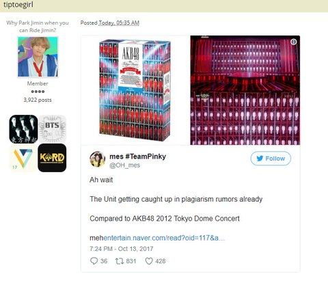 네티즌 버즈나 이런곳 퍼가기 전에는 이 포럼에서 가장 먼저 퍼갔는데. 반응은 이러하다.https://onehallyu.com/topic/591030-the-unit-gets-embroiled-in-plagiarism-accusations/