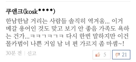 이번 화에 수아?인가 걔 몰카 찍힌거 남자 애들이 저장하고 그런 어쨋든 몰카에 대해 다룬 내용이였는데 !!일부!! 남자들이 몰카 소비하는 건 죄가 아니다 이 지랄해서 댓글로 싸우고 있음ㅋㅋ 댓글 수준 ㅆㅇㅈ