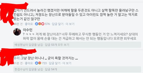 ㅉㅉ....지네 몸 아니라고 장난이라고 넘겨버리기 오지네 ㅋㅋㅋㅋㅋ모르는 사람이 지네 몸에 털끝 하나라도 건들면 조카 불쾌해 할거면서 ㅋㅋㅋㅋㅋ