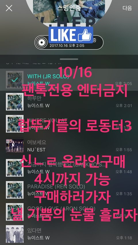 ✔✔자 또 정리!!지금부터 6시까지 5천명 안에 들어갈 수 있는 기회를 준대. 봐바. 너가 러브야. 근데 딱 지금부터 6시까지만 앨범 살 수 있어? 그럼 사 안사? 섣불리 사야지. 너 5천명 안에 들게 해준다니까??? 너 그럼 20만장 팔린 가수 덕질하는 성덕이야 . 20만장 넘기고 같이 울지 않을래 럽들? 이번이 마지막 기회야 ❤️❤️❤️ 내일 하고 싶어도 못해 돈 더준대도 못해 사랑해 럽❤️❤️