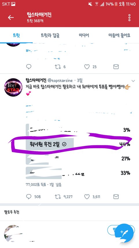 트위커 계정 있는 참팬들은 '탑스타매거진' 계정 들어가서 한번만 내리면 투표폼이 보일거야! 거기 우진이 한번씩만 누르자. 참고로 후보 네명만 있는게 아니라 아래 타그룹 멤버들 더 있어. 우진이 현재 2위고 1위랑 격차 줄일 수 있는 정도니까 한번만 투표하구 오자! 1, 2등 뽑는 거구 혜택은 메인트윗에 있어! 1등 혜택 좋으니까 도와조❤