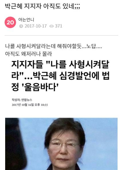 아 근혜 뭐하나 했더니 또 난리네 ㅋ근혜 지지자들이 자기를 사형시켜달라고 난리 쳤다는데ㅋㅋㅋㅋㅋㅋㅋㅋㅋㅋㅋㅋㅋㅋㅋㅋㅋㅋㅋㅋㅋㅋㅋㅋㅋㅋ무슨 신 모시듯이 하고 있네..ㄹㅇ 지지자가 내 가족이면 조카 쪽팔릴듯..