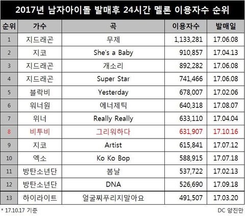 와 비투비 음원발매 후 24시간 이용자 순위