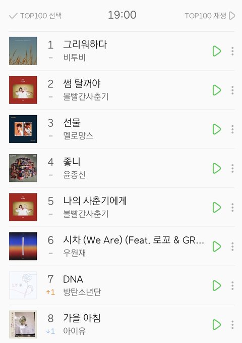 ㅈㄱㄴ 몇주전 몇달전에 컴백한 곡하고 팬덤화력 쎈 곡하고 대중 많이 듣는 곡하고 붙어서 장난아님ㅋㅋㅋㅋㅋㅋ 새벽에 치열하던데 팬덤 줄세우기 아무튼 지금 차트 대단함 그리고 비투비 좀 대단 일위,,