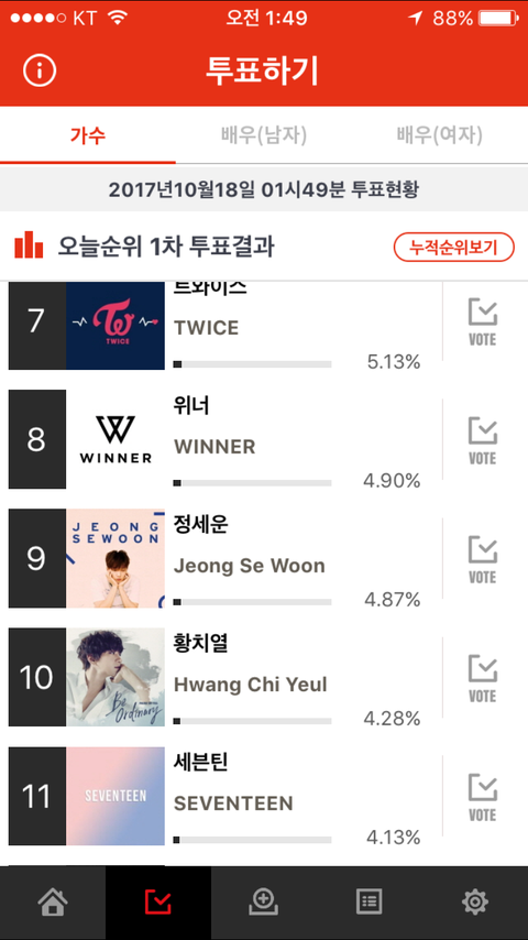누적순위는 높긴한데 현재순위 너무낮아 ㅠㅠ 빨리 투표하고 오자 캐로시들