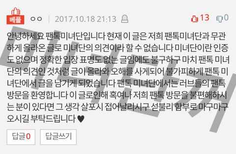 문제된 글에 대해 곧바로 피드백을 요청하였으나(댓글 수 문제로 지금은 삭제한 상태), 이 시각까지 어떤 모션도 취하지 않는 상황으로 보아 저희 팬톡 이용자가 아닌 것으로 간주하고 있습니다
