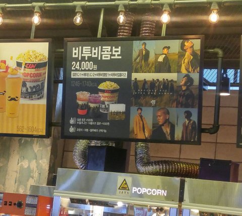 홍대 CGV 갔다가 감탄나옴.. 아이돌 비투비?라는데 그 아이돌 사진이 엘레베이터며 벽이며 뒤덮여있어.. 심지어 메뉴판이ㅋㅋㅋ 살다살다 영화관에서 이런건 또 처음봄ㅋㅋ