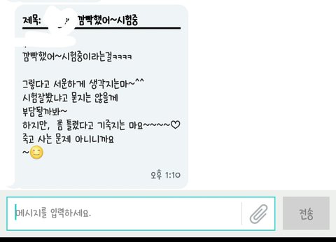 나 오늘 시험 망쳤거든 근데 엄마랑 전화하고 나서 내일 시험 준비하려고 도서관 가는 중에 엄마한테 이렇게 문자 왔어 아까 낮에 ㅠㅠ 항상 투덜거려도 엄마 진짜 사랑해요❤❤