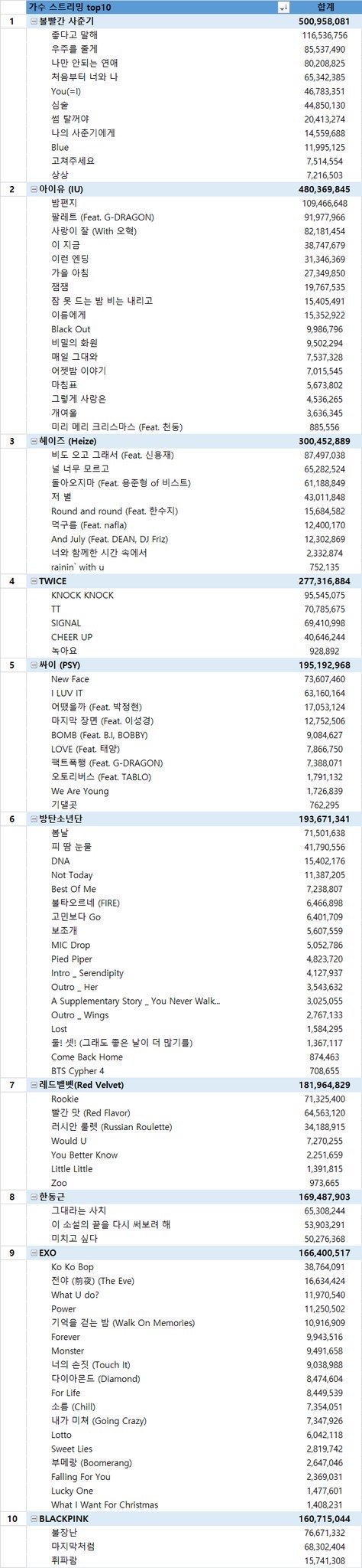+수정) 2017 가수 스트리밍 top 10
