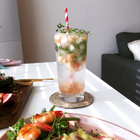 복숭아청에 탄산수, 허브로 완성.