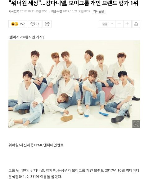 기사) "워너원 세상"...강다니엘, 보이그룹 개인 브랜드 평가 1위