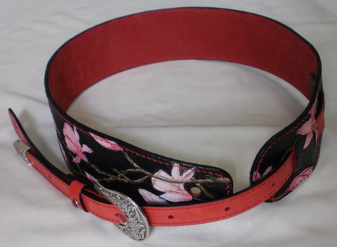 가죽에 목련을 카빙(손조각)하고 페인팅하여 제작한 핸드메이드 기타 스트랩(기타끈)입니다.
