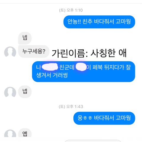 가린이름은 사칭한 남자애 이름이고 저딴식으로 남자애들한테 페메 보냈음ㅎㅎ