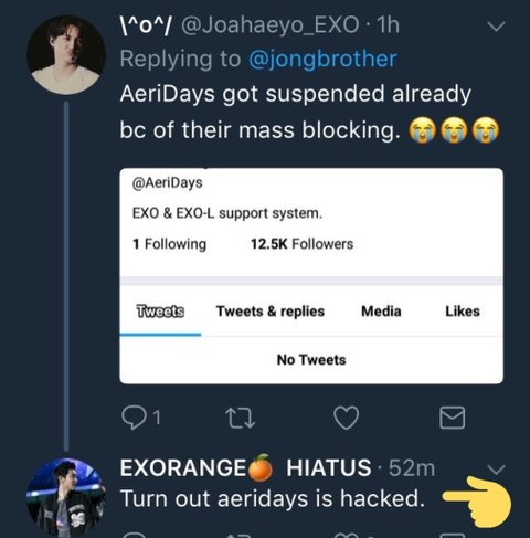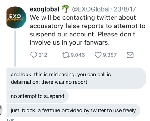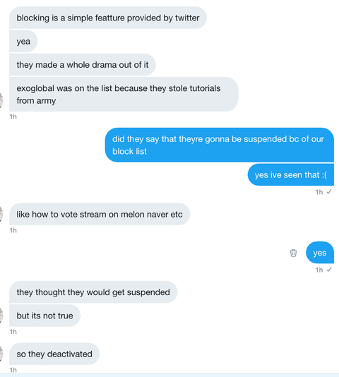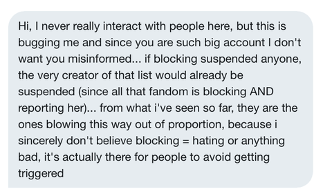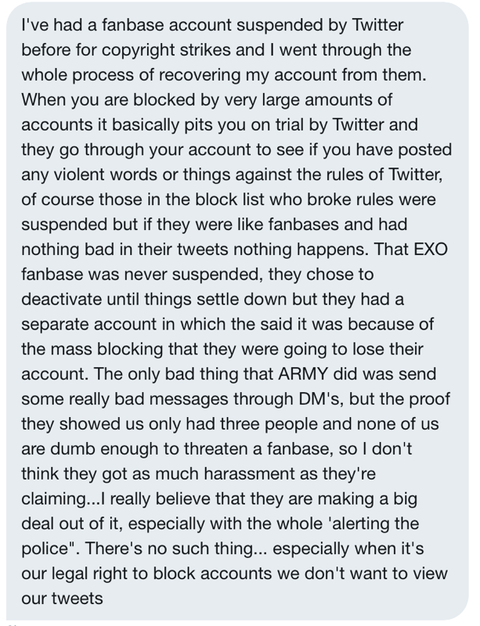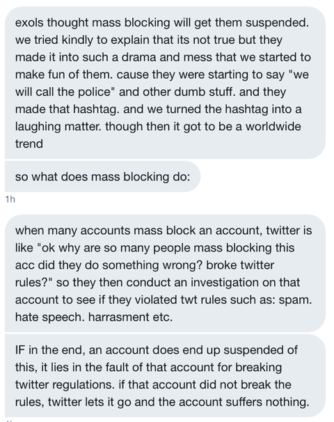 요약: 블락은 계정을 정지 시키지 않는다. 내가 보기에는 그들이 이 일을 더 커지게 만든거다. 왜냐하면 블락 = hating / 나쁜의도가 아니라 우리가 [팬덤싸움 때문에] 화나는 걸 피하려고 한거다.