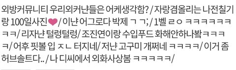 갤이 말투 제일 쎄지 ㅋㅋㅋ 갤하다가 여기오면 적응 안될때 있음 너무 친절해서 가끔 오 글거리기도 하고 ㅋㅋㅋㅋ 갤따라 다른데 분위기 좋은갤은 적당히 안오글거리고 덕질하게 ㄹㅇ 편함 갠갤은 정도도 잘지키고 규율도 빡센편이라