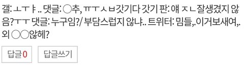 스쉐: (사진) 너무 잘생겼다♥ 복숭아스러워ㅜㅜ (댓글) ㅈㅂㅈㅇ/ 저사람 00임 (답댓글) 왜 저도 아닌데 정보줘요? / (답댓글삭제)