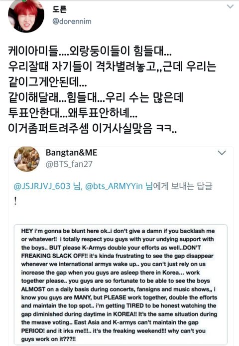 지금 추이 보면몰라? 새벽에 외랑둥이들이 투표해서 역전해놓은거 저쪽이 아침되면 깨서 국내화력으로 다시 역전해서 벌려놓는거잖아 이거 우리 외랑둥이랑 힘합쳐서 배로 열심히해야해 너무 외랑둥이한테 기대지마 너네 저쪽 좀있으면 중국팬들도 들어온다는거 알고있잖아 우리 진짜 이대로는 절대안됨 큰일나 제발 대책세우자