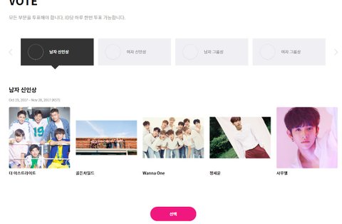 근데 하... 모든 부문 다 선택해야 투표 제출할 수 있는것도 있는건데, 더 빡치는건 각 부문 가수 정하고>선택 눌러야지만 다음 부문으로 넘어갈 수 있음.