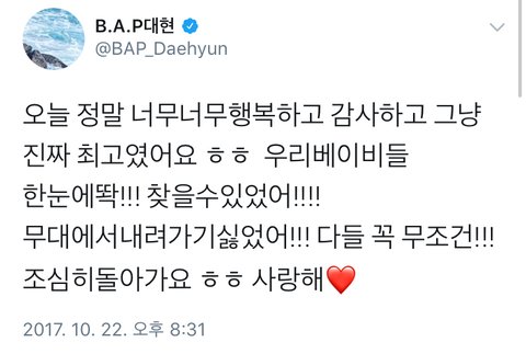 난 지방수니고 학생이라 사실 오늘 첨으로 실물본건데ㅠ 진짜 너무너무말도안되게 잘생겼어ㅓ... 레드카펫때부터 전광판에 나오는데 진심 다 너무 잘생겼고 비율도장난아니고ㅠㅠ대현이랑 애들 말하는데 관계자분께서 하는말이랑 계속 겹쳐서 잘 못들은게아쉽지만 너무 멋있었음..ㅠㅠ 첨에 오프닝한다고 가수들 다 나와서 인사하는데 3층이지만 난 팬석에 앉아있었는데 딱 이쪽보면서 계속 인사해주고ㅠㅠ 손 둥글게 흔들면서 인사해주고ㅠㅠㅠㅠㅠ너무 고마웠따.. 그러고 본무대때 인트로하고 멋있게 등장하는데 첫 간주부터 이미 으악새등장ㅠㅜㅜ너무 잘생겼고 전광판에 첫소절 힘찬이 딱 잡혔는데 와 진짜잘생겼음 너무잘생긴게 다른멤버들도 짱인데 힘찬이랑 영재랑 실물갑인듯.. 전광판으로봤는데도 잘생기고 막 쩔었다ㅠㅠㅠㅠ 멤버들 비율도 장난아니고 춤도잘추고 라이브도 진심 완벽하고 최고였어ㅠ