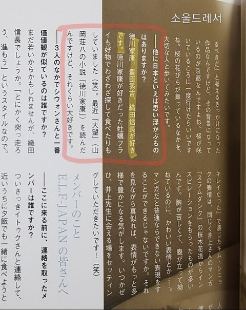 A. 도쿠가와 이에야스(덕천가강), 도요토미 히데요시(풍신수길), 오다 노부나가(직전신장)를 좋아합니다. 도쿠가와 이에야스를 좋아해서, 그가 좋아했던 굴튀김을 일부러 찾아가서 먹기도 했습니다. (중략)