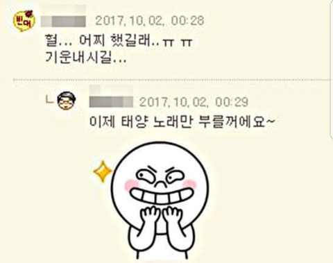 심지어 댓글 반응도 씹가관임. 지가 잘못해놓고 반성의기미도 없고 지디가 청구액을 1000분의 1로 줄여줬음에도 불구하고 이 글쓴이는 태양노래만 불러야겠다는둥 오히려 지디랑 지디카페를 비하하고있음ㅋㅋㅋㅋㅋㅋㅋㅋㅋㅋㅋ 누가보면 지디가 잘못한줄ㅋㅋㅋㅋㅋㅋㅋㅋㅋ 와 지금 개빡쳐 별 사람이 다있음. 너희는 어떻게 생각해?ㅋㅋㅋㅋㅋ 내가 지디좋아해서 빡치는거아니지?