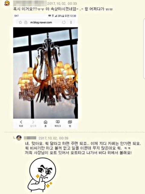 근데 이 글쓴이가 100퍼센트 본인의 잘못으로 이 3억짜리 샹들리에를 깨트렸음. 하지만 지디의 킹갓제너럴부처급인성으로 부품비는 내가 낼테니 그 손님한테 30-50만원의 수리비만 달라고 했음. 근데 그 손님이 한 카페에 이런 글을 올림.