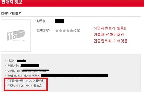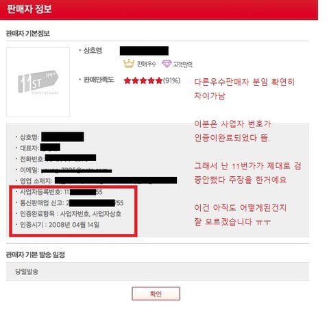 다만 11번가의 다른 상품 판매자는 다 사업자조회가 되는데 이분만 안되고, 아래첨부된 사진에 보시면 확인내용에 이름과 전화번호밖에 안떠요. 다른 판매자분들은 사업자까지 확인되엇다고 뜨구요.