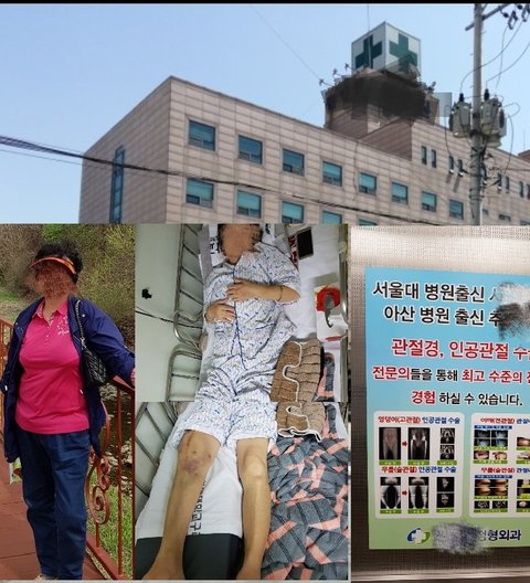 ㅇ병원 내과는 어머니께서 20년을 다니던 병원이고 정형외과 새로 부임한 추**과장이 아산서 꽤 유명했다고 이야기가 있어 내원했습니다. 검사한결과 연골이 파열되서 수술밖에 방법이 없다고 하였습니다. 수술하기 싫다는 어머니를 정형외과 과장은 자기를 믿고 맡기면 절대적으로 20대의 다리처럼 멀쩡해진다고 또한 요즘은 밥먹고 하는게 이 수술이라고 현재 이 ㅇ병원에 와서는 300명 가까이 했지만 부작용이나 수술 실패한적 절대 없었다고 걱정말라고 하여서 안심하고 수술하기로 결정했습니다. 검사후 이참에 허리 협착도 같이 하자고 협착시술과 연골수술을 이틀에 나누어 하게 되었습니다.수술은 만족할 만하게 잘 되었으니 회복만 하면 된다고 했고 그런데 담날부터 수술전과 같이 붓기 시작했습니다. 피를 빼도 빼도 계속 고이는상태였습니다. 하지만 과장님은 수술후 그럴수 있다고 하였고 며칠이 지났는데도 부종은 점점 심하고 주사기로 빼는걸 보니 피색깔도 바뀌었습니다.염증이 생겨그렇다고...정말 대수롭지 않게 간혹 그럴수 있고 그냥 수술한번 다시 하죠 이런식은 말로 2차 하고나면 정말 가벼워 질꺼라고 그때는 사고라고 생각도 안했습니다. 2차 수술위해 퇴원후 바로 재입원과 동시에 다음날 수술을 하고도 회복될 기미가 보이지 않았으며 수술부위에 열감과 극심한 통증으로 3차까지 수술을 하였습니다. 수술후 3일만에 병원 내 감염의 주범인 (슈퍼박테리아 MRSA 포도산균)이 나왔고 의사는 항생제 치료하면 4주안에 퇴원이니 걱정말라 하였습니다. 저는 다시 제차 대학 병원 격리실로 가야하지 않냐구 물었고 그 의사은 우리 ㅇ병원도 치료책이 있기때문에 걱정말라는 얘기였습니다. 그 말만 믿고 1인실로 옮긴후 치료를 하였습니다. 하지만 상태는 점점 심해지셨고 의사는 그제서야 대학병원으로 이송해야 된다고 하였습니다. 어머니는 대학병원에 가신후 검사를 다시 받으셨고 담당교수님은 항생제 농도조절이 안되서 처음부터 치료를 다시 시작해야 했습니다. 치료는 긴 싸움이 될수 있다하였고 어쩜 다리기능 상실을 할 수도 있고 앞으로 6번이상의 수술이 들어 갈 꺼 라고 했습니다. 그렇게 지금까지 9번째 수술을 한 후...결과는 박테리아에 저희 어머님이 지셨습니다.. 염증수치는 아직까지 잡히지 않고 있고 다리상태는 이미 연골과 인대가 없는상태이고 뼈들은 다 따로 놀고 독한 주사와 약으로 연명하시고 계십니다.
