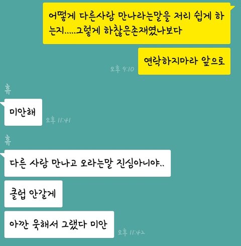 '아니 상식적으로 생각해봐. 오빠 환승하고 나한테 돌아왔을때 내가 나도 다른사람좀 만나보고오자 라고 장난으로 말할때 오빠가 만나고 오라며......그래서 내가 얼마전에 진짜? 라고 하니까 미쳤냐라고 말 바꿨잖아. 난 그게 비상식적인 행동인거 아니까 농담에서 그치는거고......'