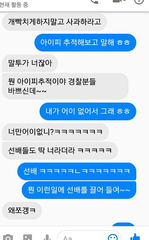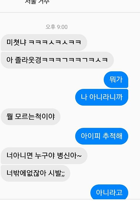 ++어 지금 봤는데 일단 오늘 학교가서 페메한 것도 보여드리고 어이피 추적 계속 안한다고 하면 명예 훼손이랑 허위 유포 사실으로 신고한다고 하려고