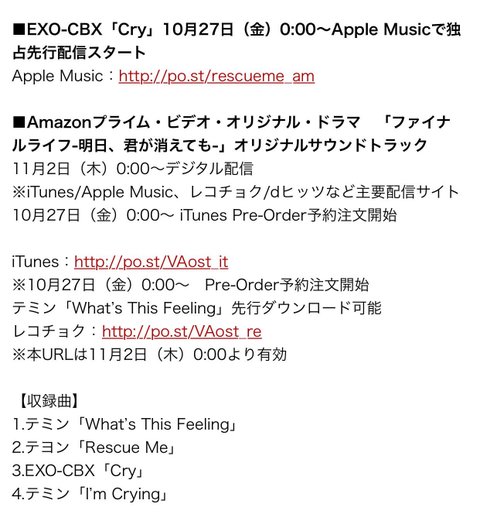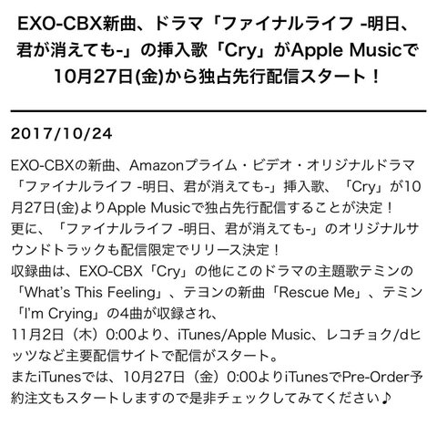 첸백시가 부른 태민선배님의 일본드라마 오스트 Cry가 아이튠즈로 나온대ㅠㅠ 안드쓰는 웅녀들은 멜론을 기다립시다