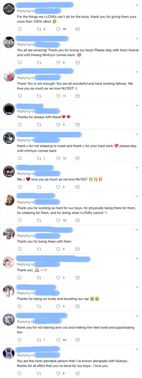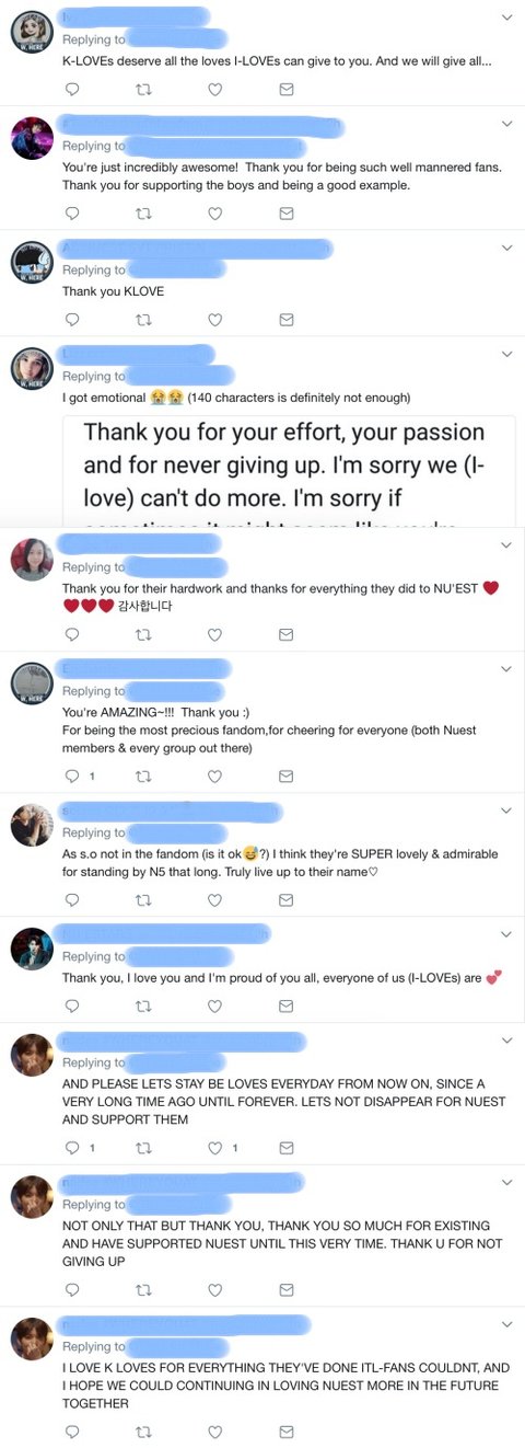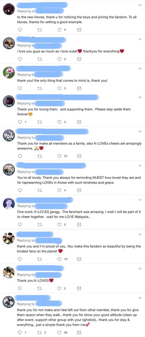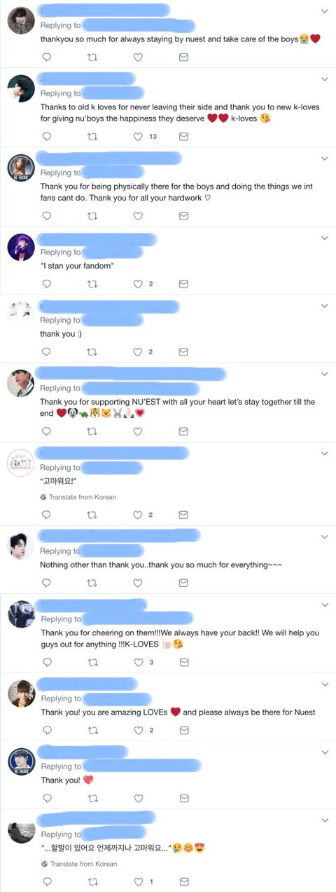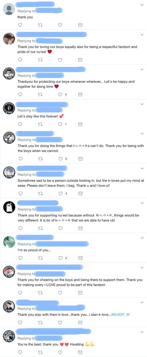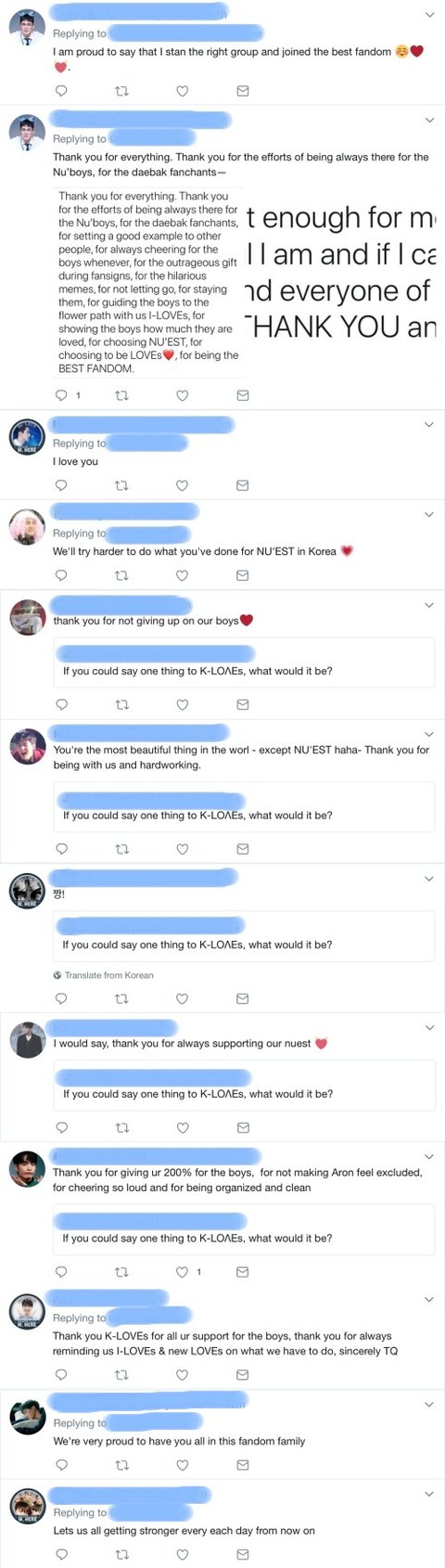 - 전부터 있던 한국럽들은 뉴이스트 곁을 떠나지 않아서 너무 고맙고, 이번에 새로 입덕한 한국럽들은 애들에게 행복을 줘서 고마워요. 한국럽들 사랑해요