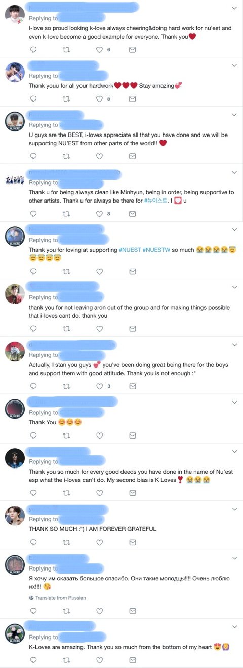 - 저에게 한국럽들이랑 뉴이스트는 세상에서 가장 사랑스러운 사람들이에요. 항상 애들을 위해 노력해줘서 고마워요.. 사랑해요