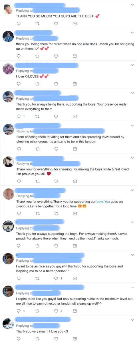 - 애들을 항상 따뜻하게 대해줘서 고맙고 다른 그룹들이 공연할때 함께 응원해줘서 고마워요! 앞으로도 럽들의 좋은 명예를 다 함께 유지해요!