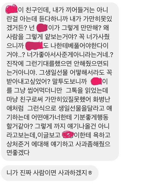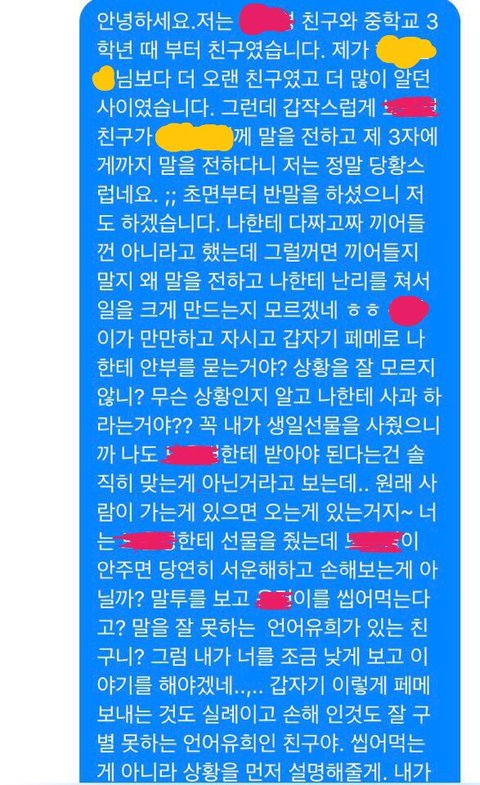 그래서 카톡을 안읽고 있다가 얘기가 끝났는데 다음날 그 친구의 친구가 문자로 이렇게 왔습니다.