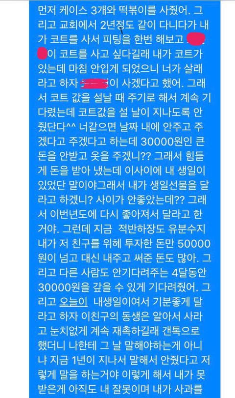 그리고 설날에 돈을 받기로 했습니다. 그런데 기간이 지날 수 록 안주는겁니다. 그리고 저만 보면 얘기하려고 해도 피하는겁니다. 그 사이에 있던 제 생일에는 당연히 내 생일선물을 받지 못 하였습니다.